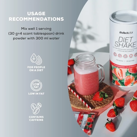 BioTechUSA Diet Shake е диетален протеински оброк во прашок, создаден за лица кои сакаат да го поддржат процесот на контрола на тежината и чувство на ситост во рамки на урамнотежена исхрана. Формулата комбинира концентрат на протеин со висок процент на растворливи диететски влакна, вклучително глукоманан и друг вид растворливи влакна, со што промовира поддршка за ситост помеѓу оброците и намален внес на калории.