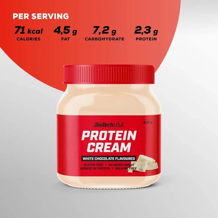 Откријте го неодоливиот вкус на BioTechUSA Protein Cream, совршен за оние кои сакаат слатки јадења, но го ценат здравиот начин на живот. Овој кремаст сон од бело чоколадо нема додаден шеќер и е збогатен со висококвалитетен протеин од сурутка. Уживајте го како намаз или во вашите омилени рецепти – без грижа на совест и со интензивен вкус.